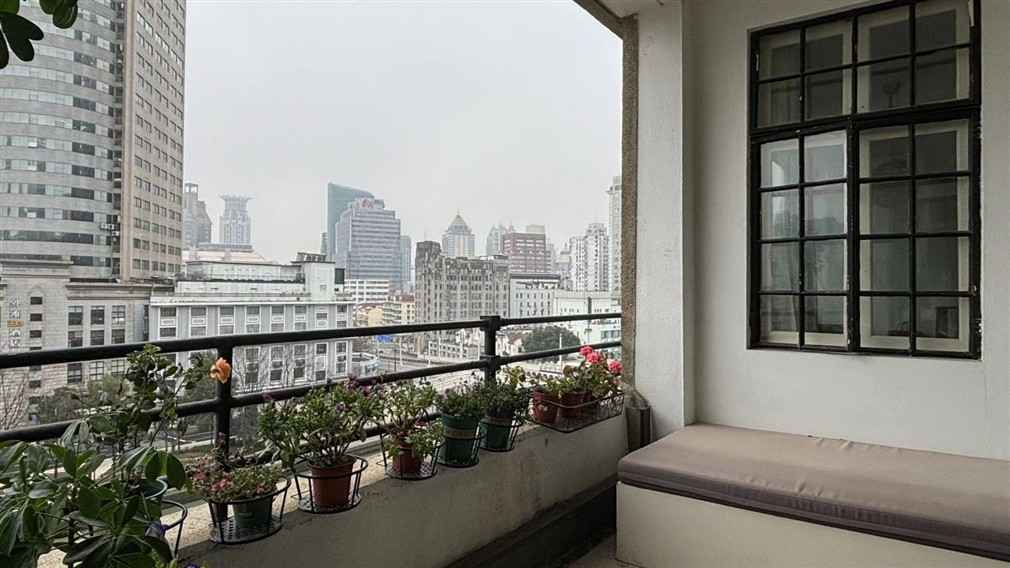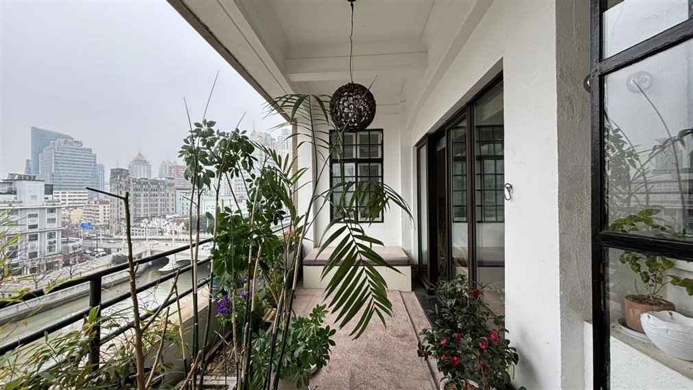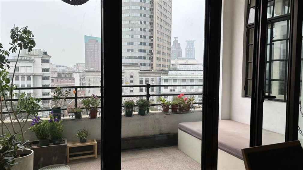The balcony opens to a beautiful view of old Shanghai’s skyline, surrounded by potted greenery and charming details that bring life to every shot. It’s perfect for morning or sunset scenes, creating a natural cinematic backdrop for your project.